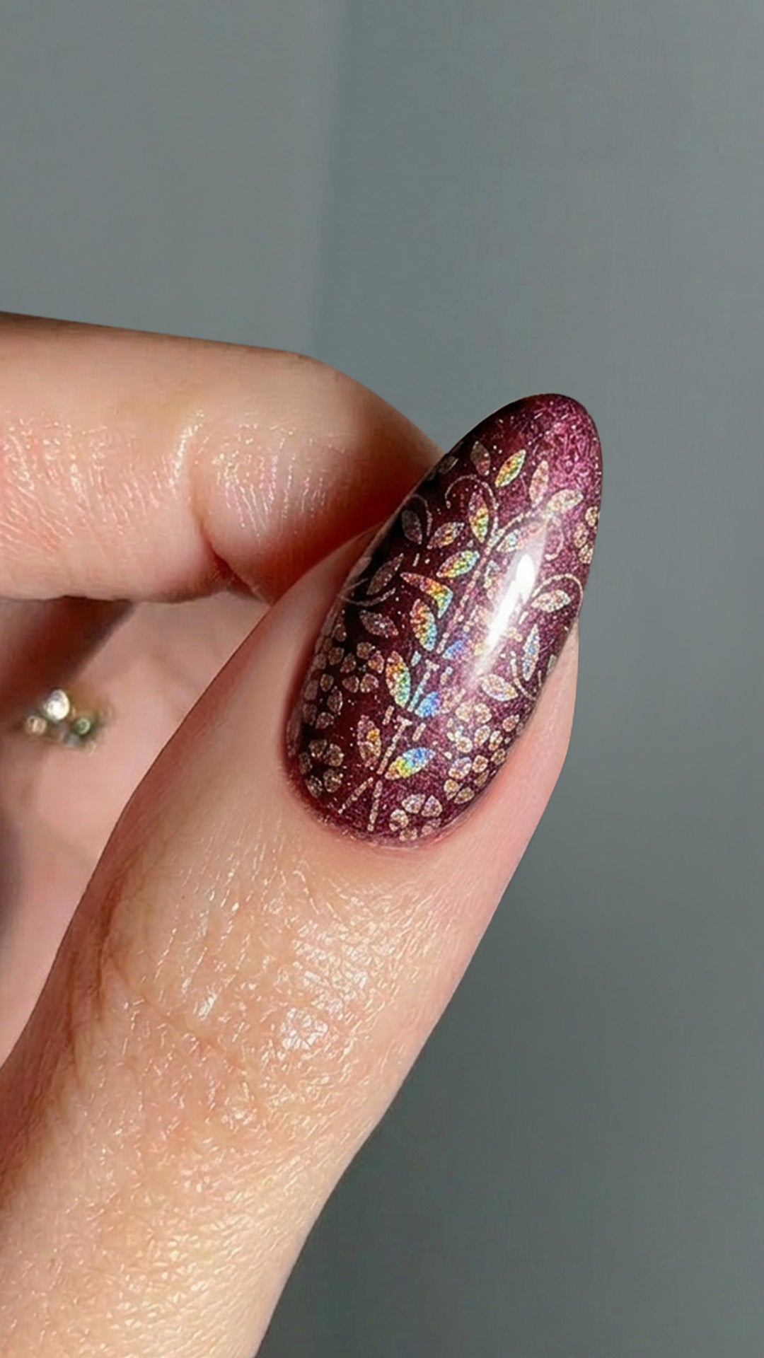 Step 6: Stamp design onto your nail, checking through the base for placement. Press once firmly and lift. Set under LED for 1 min.