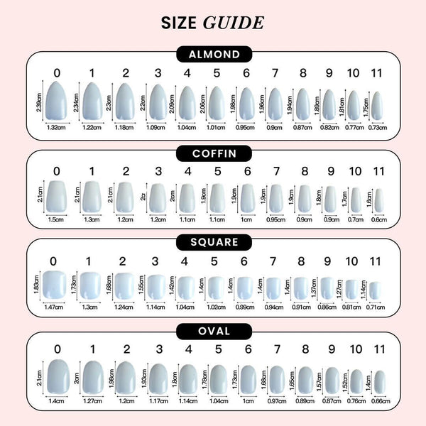 There is a range of sizes in the pack to cater to all nail types and the nails can also be shaped to your size using the file. For further information, refer to our size guide.
