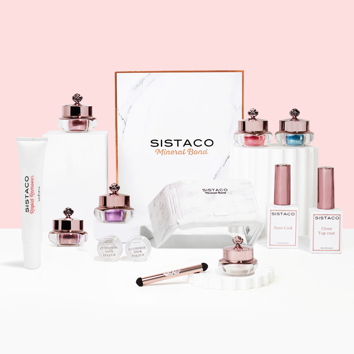 The Ultimate Set Includes: 1 x Marble LED Lamp 36W, with sidelights for 180º all-over setting, and two timer settings (press once for 60 seconds, press and hold for 120 seconds) 1 x 16-Free Base Coat (Bottle) 1 x 16-Free Top Coat (Bottle) 6 x Nail Colours In Any Colour Of Your Choice 2 x Customise Your Colour Mixing Pots 1 x Mineral Bond Applicator 1 x Updated Marble and Rose Gold Luxurious Box 1 x Instructions Card 1 x FREE Rapid Remover