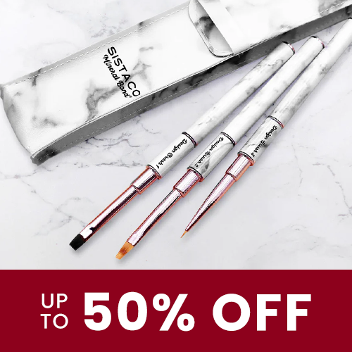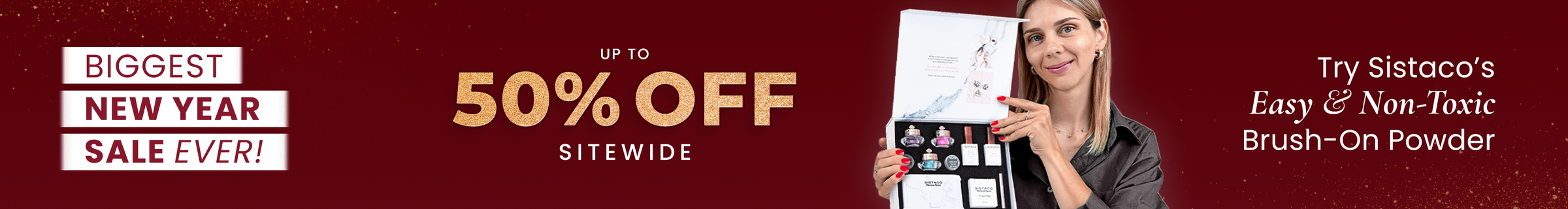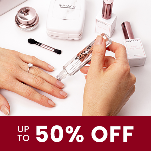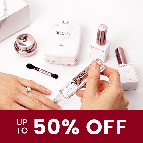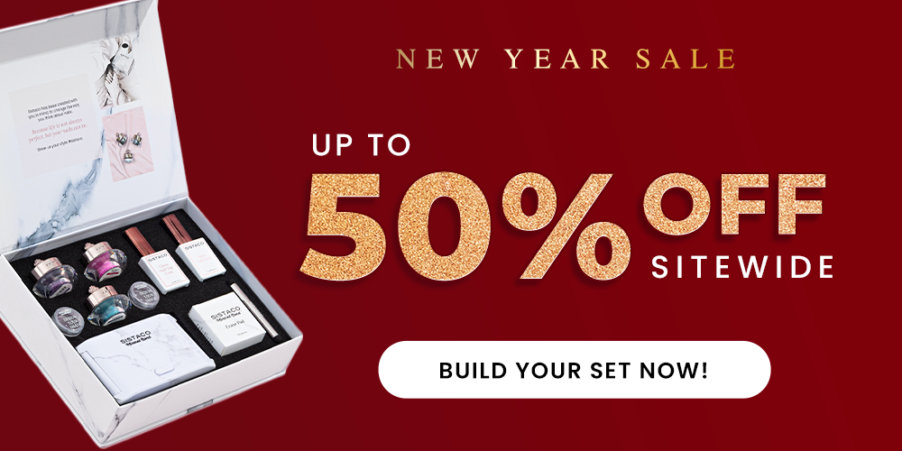 Remove the top protective film from the Nail Tab. Apply the 'Sistaco Sustainable Nail' at an angle, starting near the cuticle, and firmly press the center to secure it in place.